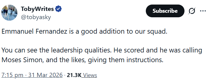 "Emmanuel Fernandez is a good addition to our squad. You can see the leadership qualities. He scored and he was calling Moses Simon, and the likes, giving them instructions," one said.