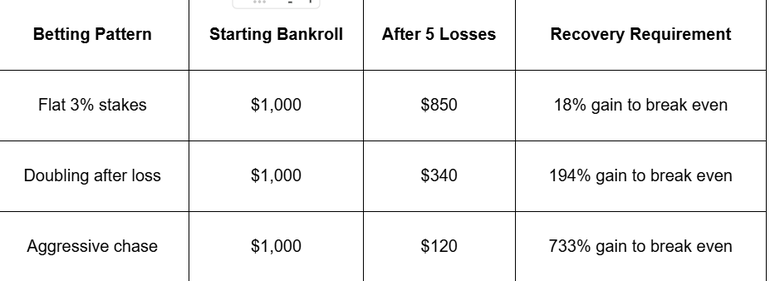 Flat betting eliminates the trap entirely. Stake 2-5% of total bankroll per wager, maintaining this percentage regardless of results. A $1,000 bankroll means $20-50 per bet. During cold streaks, absolute stakes shrink automatically, protecting capital. During hot runs, growing bankroll naturally increases bet sizes without manual adjustment.