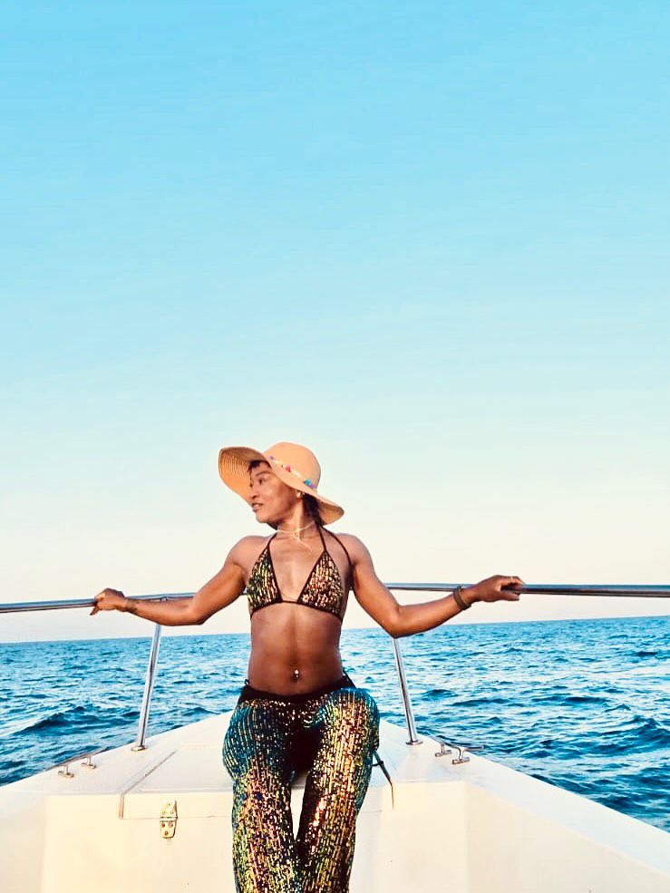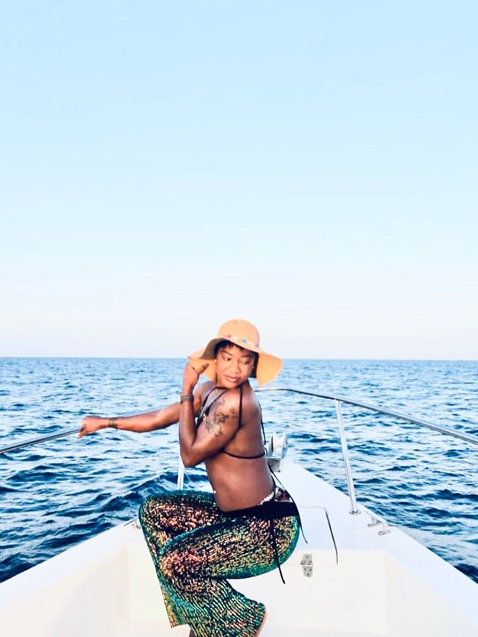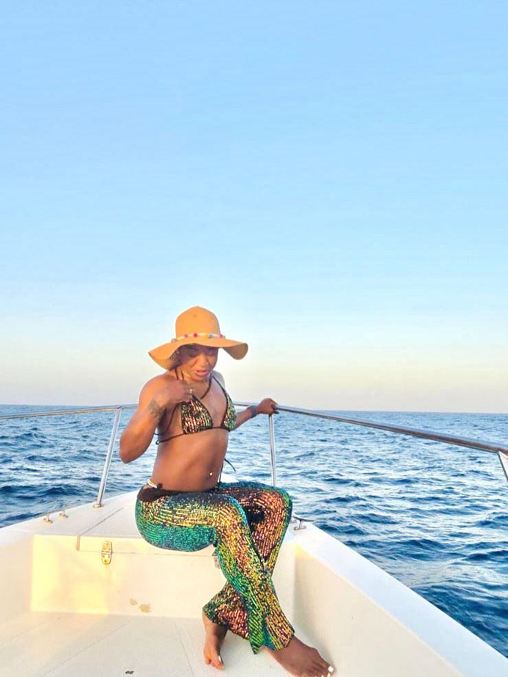 She shared a stunning series of photos from a yacht outing dressed in a vibrant bikini, multicolored pants, and wide-brimmed hat.