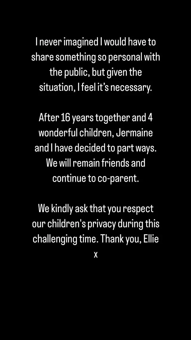 "I never imagined I would have to share something so personal with the public, but given the situation, I feel it's necessary. After 16 years together and 4 wonderful children, Jermaine and I have decided to part ways. We will remain friends and continue to co-parent. We kindly ask that you respect our children's privacy during this challenging time. Thank you, Ellie."