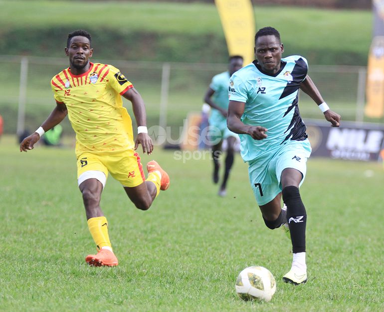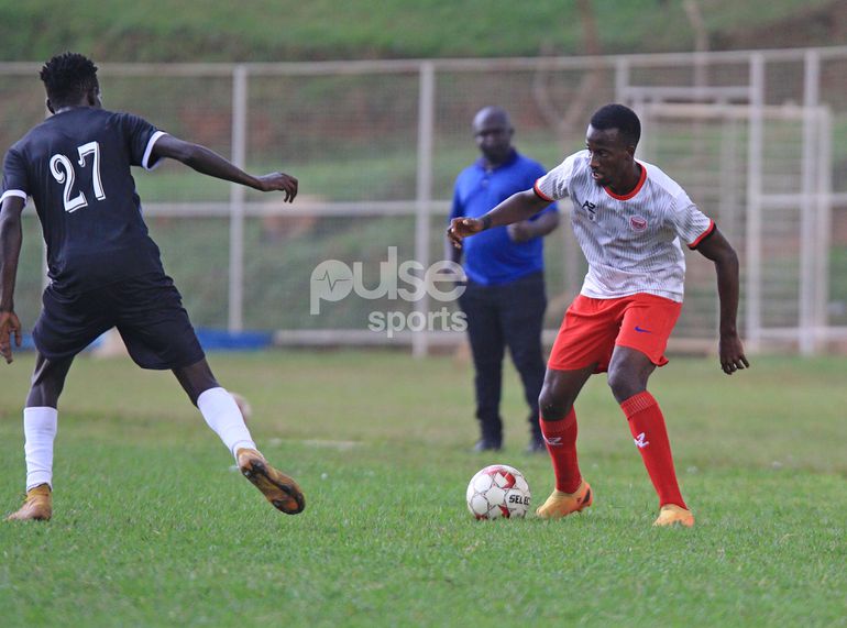 Alpha Ssaali (R) of Express FC takes on a Police FC player during their friendly in a friendly game at Wankulukuku which was later abandoned due to heavy rain – | Pulse Sports image