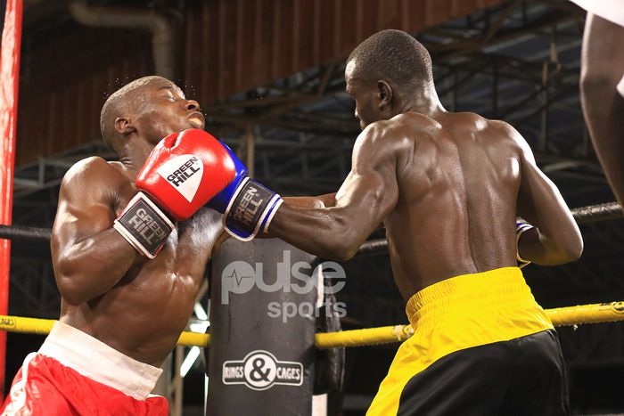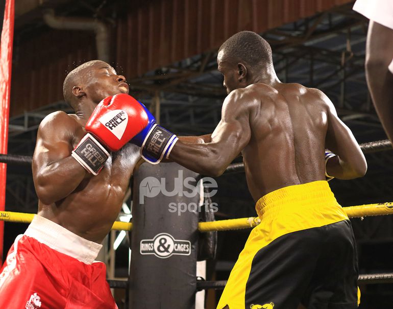 Khassim Mulungi (red) was on the receiving end of a hard-left jab from Derrick Mubiru (black) in the main fight of week 10 of the Uganda Boxing Champions League fight night in Wandegeya| Pulse Sports image
