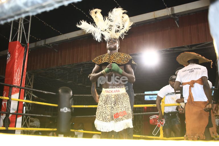 Paul Raskara dressed in the Acholi traditional wear before taking on Innocent Amoko in the lightweight bout during week 10 of the Boxing Champions League in Wandegeya| Pulse Sports image