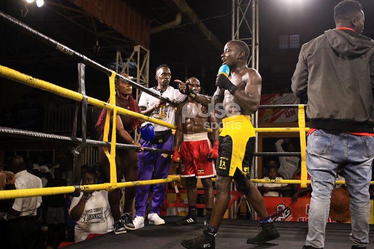 An unsatisfied Derrick Mubiru reacts to his loss against Khasim Mulungi in the main bout of week 10 of the Uganda Boxing Champions League. He accused the officials of handing over victory to his opponent | Pulse Sports image