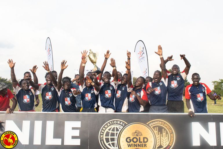 Victoria University players celebrate winning the second circuit of the University Rugby 7s defeating Uganda Martyrs Nkozi 33-7 in the final held at Kyambogo University on Saturday | Uganda Rugby Union image
