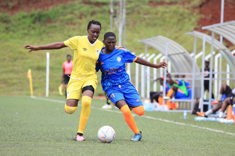 Bridget Nabisaalu (yellow) takes on an opponent during a friendly game between the Crested Cranes and the Kampala Select team in Njeru which ended 3-2 in favor of the Crested Cranes | Crested Cranes image