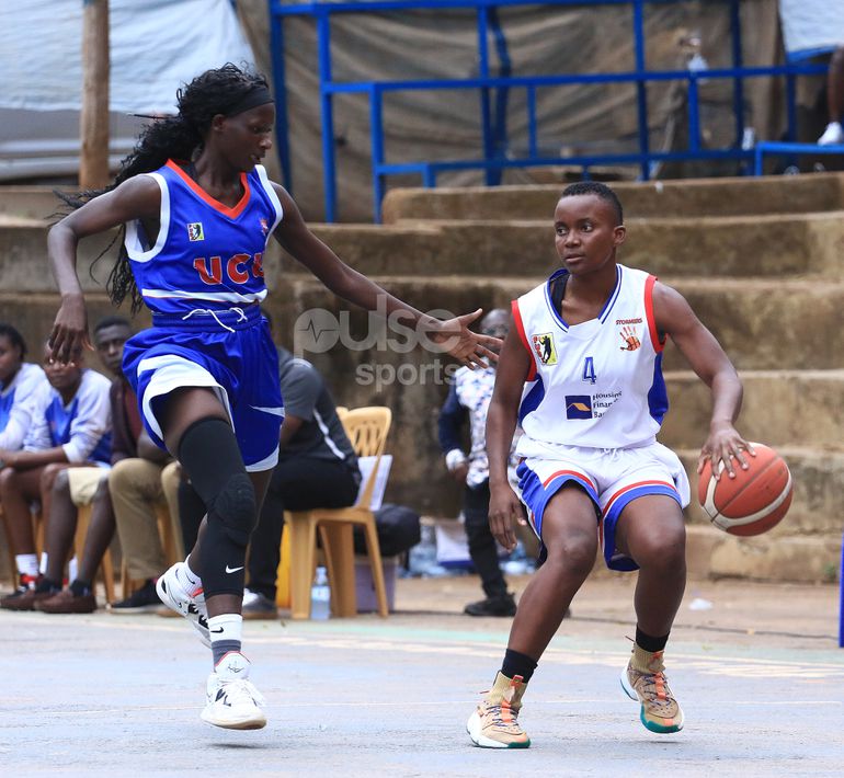 Shillah Lamunu (blue) of the UCU Lady Canons takes on Daniella Nyamwezi (white) of the Magic Stormers during their regular-season finale which ended 75-57 in favour of the Lady Canons at the YMCA court | Pulse Sports image