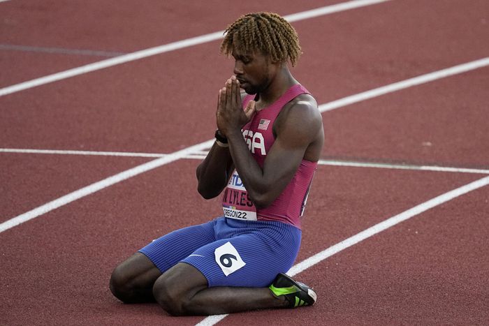 Noah Lyles prays after smashing the American 200m record back in 2022 || Courtesy