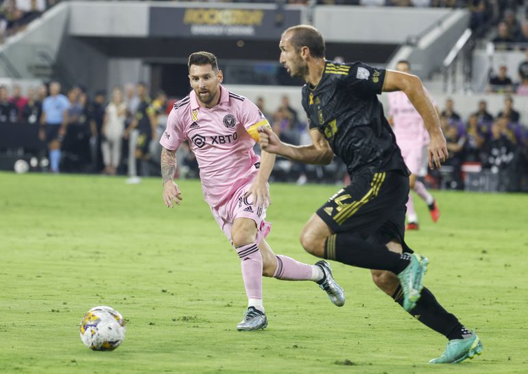 Giorgio Chiellini of Los Angeles against Lionel Messi of Inter Miami in the MLS
