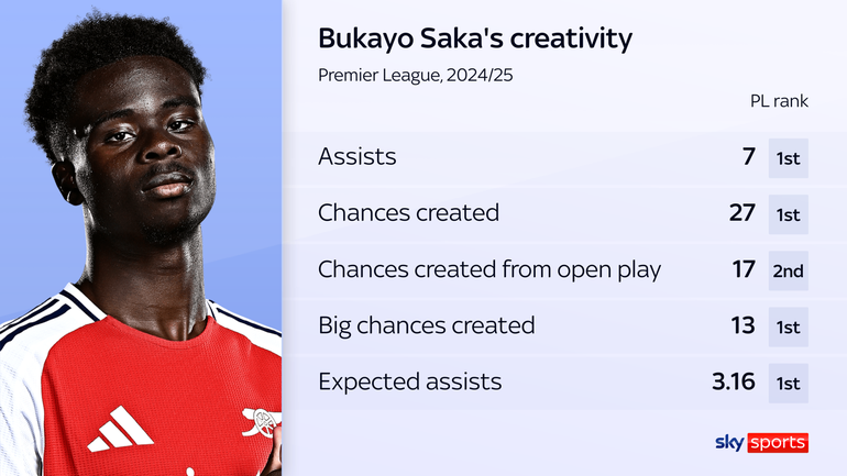 The absence of injured Arsenal captain Martin Odegaard has allowed Saka to take on more creative responsibility and it is paying dividends.