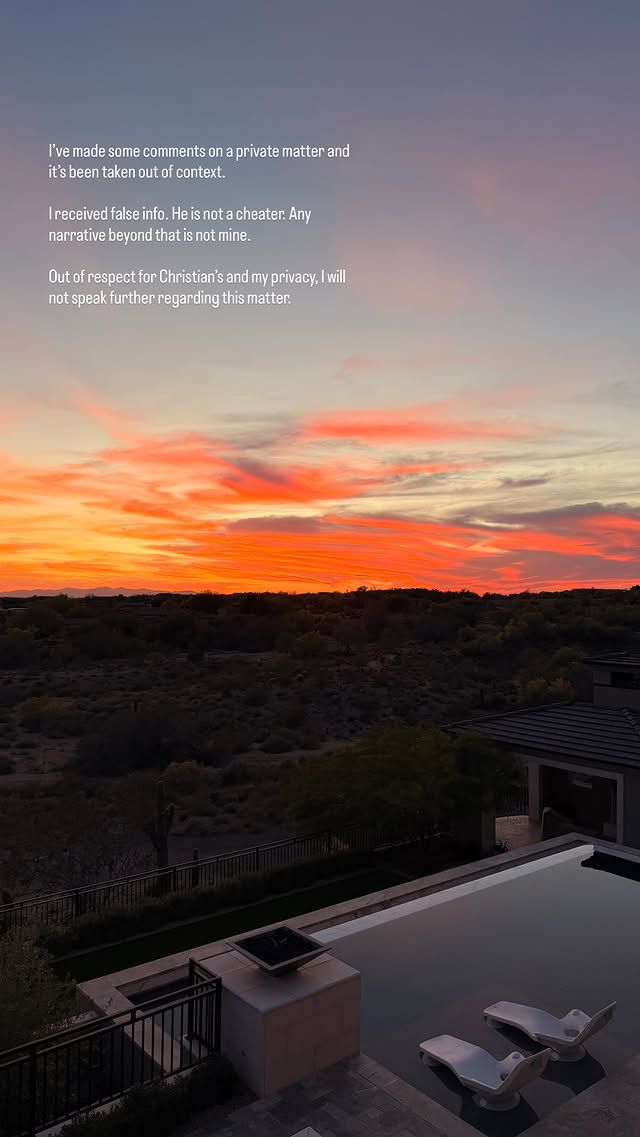 “I’ve made some comments on a private matter and it’s been taken out of context. I received false info. He is not a cheater. Any narrative beyond that is not mine. Out of respect for Christian’s and my privacy, I will not speak further regarding this matter,” the 25-year-old California native shared to her 140,000 followers on Thursday, 9 April.