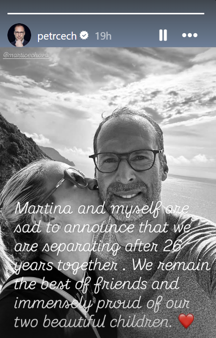 Cech wrote on Thursday, August 14: "Martina and myself are sad to announce that we are separating after 26 years together. We remain best friends and immensely proud of our two children."