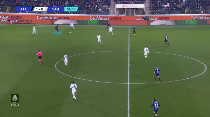 Lookman received the ball in a wide area against Sampdoria with the rest of the defence occupied by Hojlund and Boga (Via Wyscout)