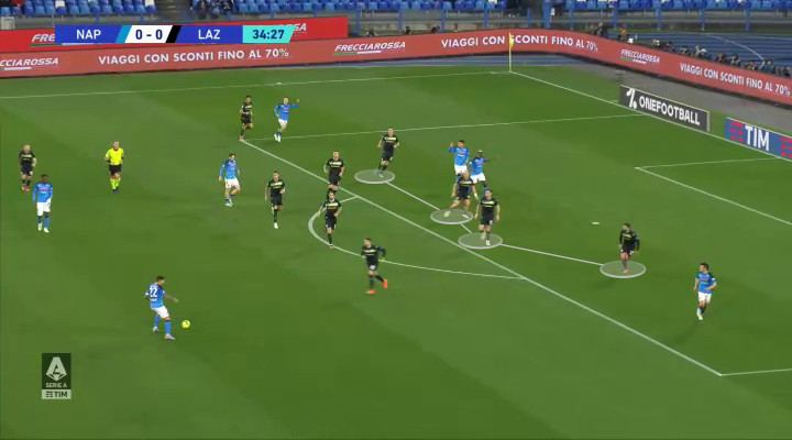 While it was not a concerted strategy of Lazio’s, they nevertheless were aggressive in terms of pushing up to catch Osimhen – not the most attentive when it comes to staying on the right side of the line at the best of times – out.