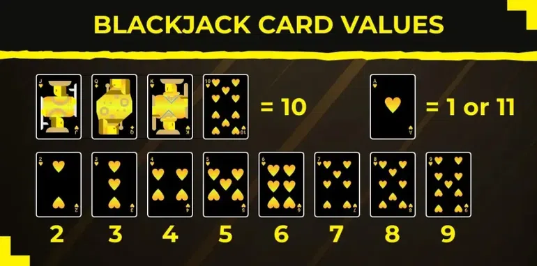 Blackjack uses a standard 52-card deck, and the card values are straightforward:
