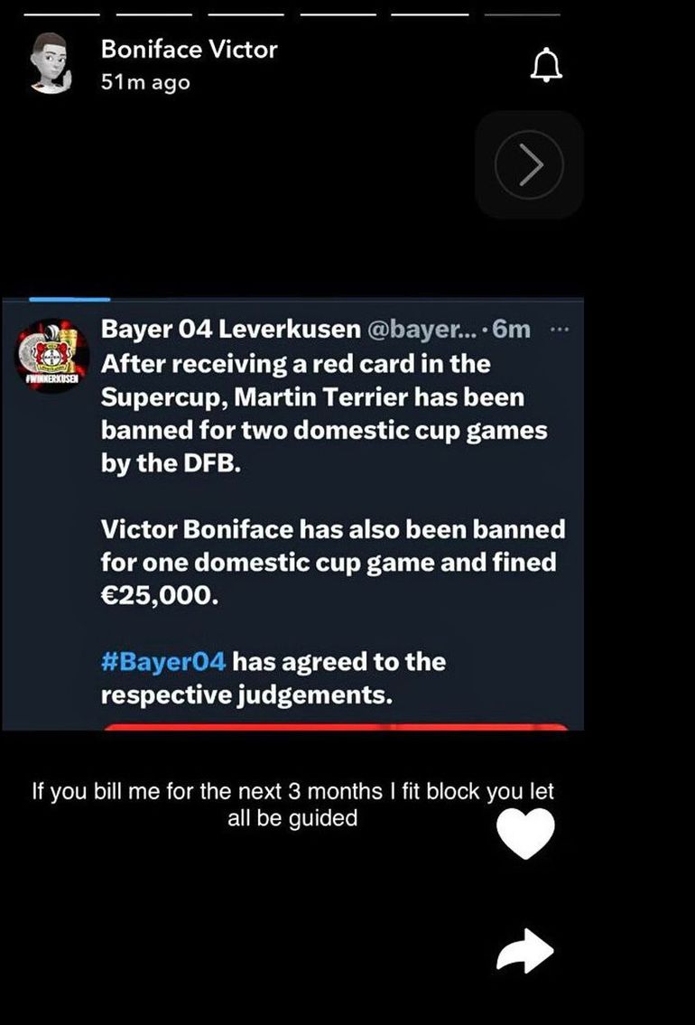 Boniface shared on his official Snapchat account, as reported by Soccernet, “If you bill me for the next three months, I fit block you. Let’s all be guided.”