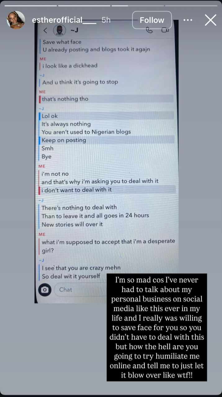 As the controversy spread across social media, Esther continued to post screenshots, including an alleged heated Snapchat exchange with Ighalo.