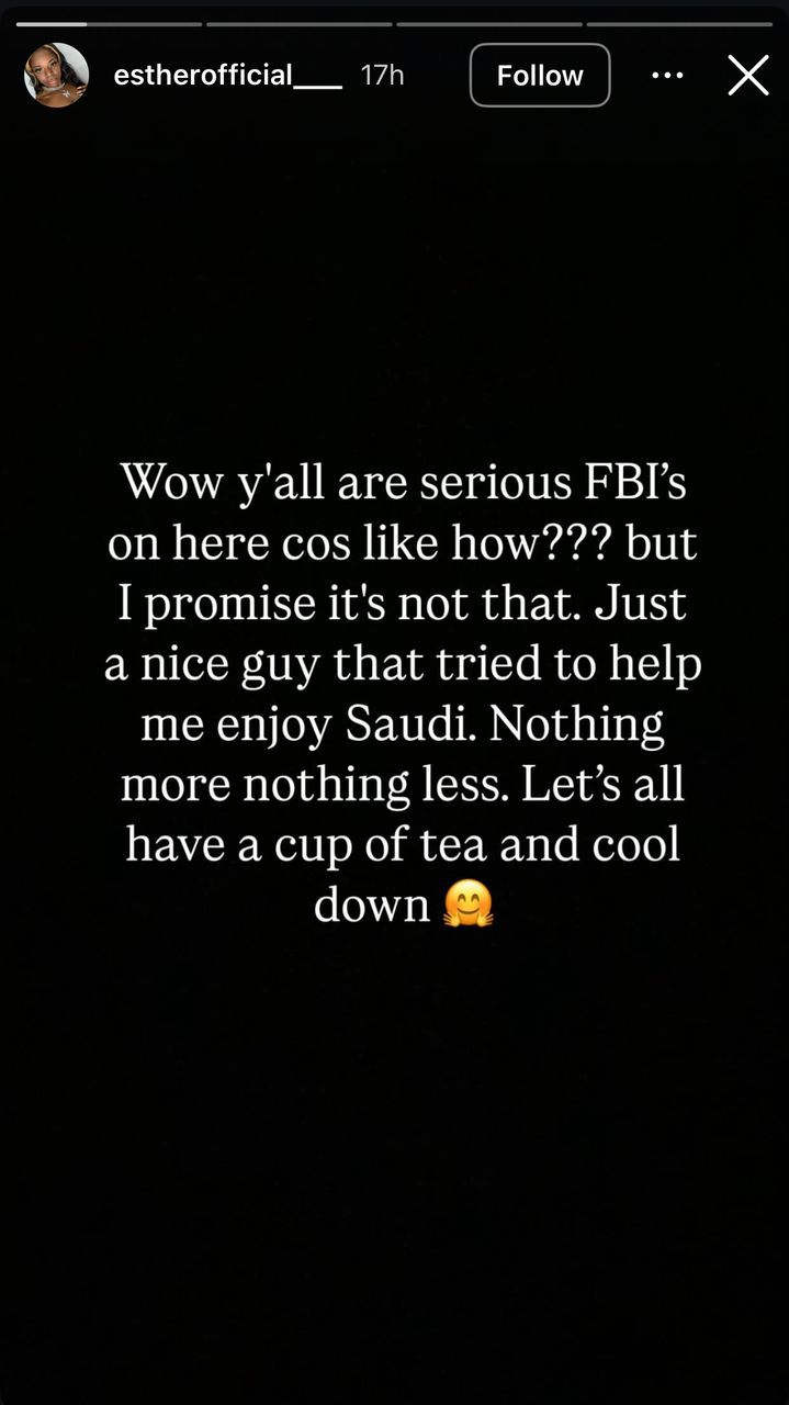 “Wow y'all are serious FBI's on here cos like how??? but I promise it's not that. Just a nice guy that tried to help me enjoy Saudi. Nothing more nothing less. Let's all have a cup of tea and cool down.”