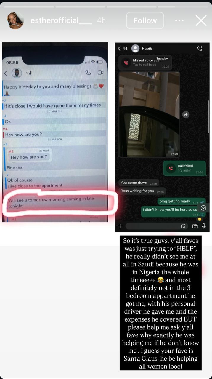 The drama escalated after Esther shared photos and messages that allegedly prove she stayed at Ighalo’s mansion in Saudi Arabia and even used his personal driver.