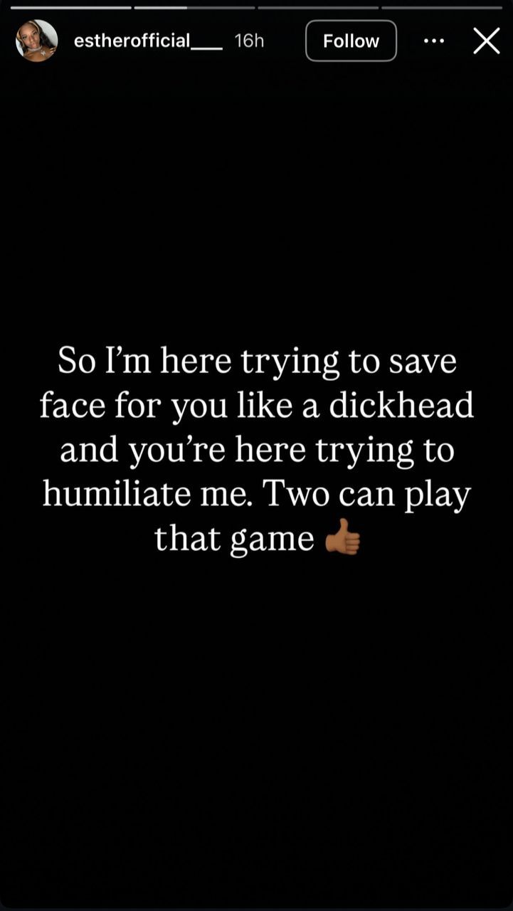 “I'm so mad cos I've never had to talk about my personal business on social media like this ever in my life and I really was willing to save face for you so you didn't have to deal with this but how the hell are you going to try humiliate me online and tell me to just let it blow over like wtf!!”
