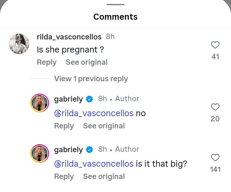 Gabriely sharply responded: "No", before joking with another four-word reply: “Is it that big?”