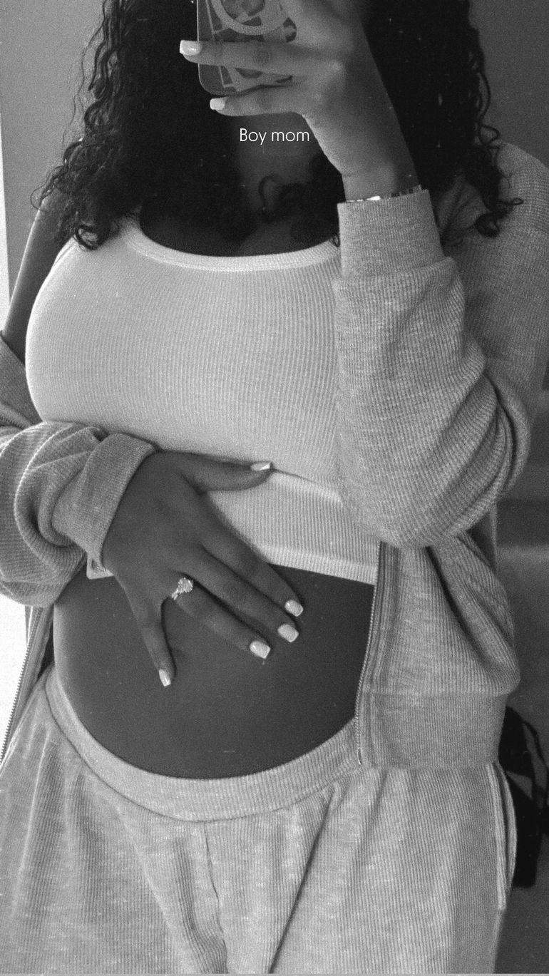 Shireen, 29, also took to her Instagram Stories to share a stunning black-and-white mirror selfie that has fans melting. In the photo, the glowing mum-to-be stands proudly in a fitted white ribbed crop top and unzipped grey jacket, one hand gently cradling her bare baby bump while the other holds her phone. She captioned the post: "boy mom."