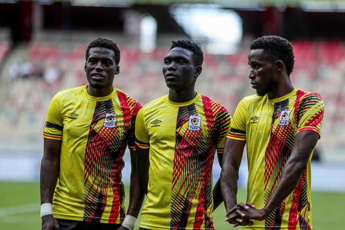 Fahad Bayo (left), Mato Rogers (middle) and Halid Lwaliwa (right) during the Algeria game in Cameroon. (FUFA Media).
