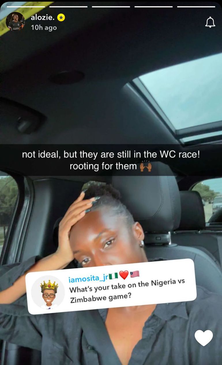 Alozie, widely considered the 'hottest Nigerian female footballer', took to Snapchat to share her thoughts on the match.