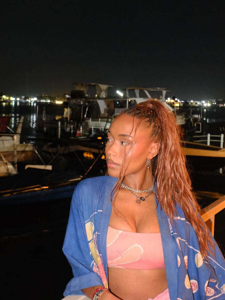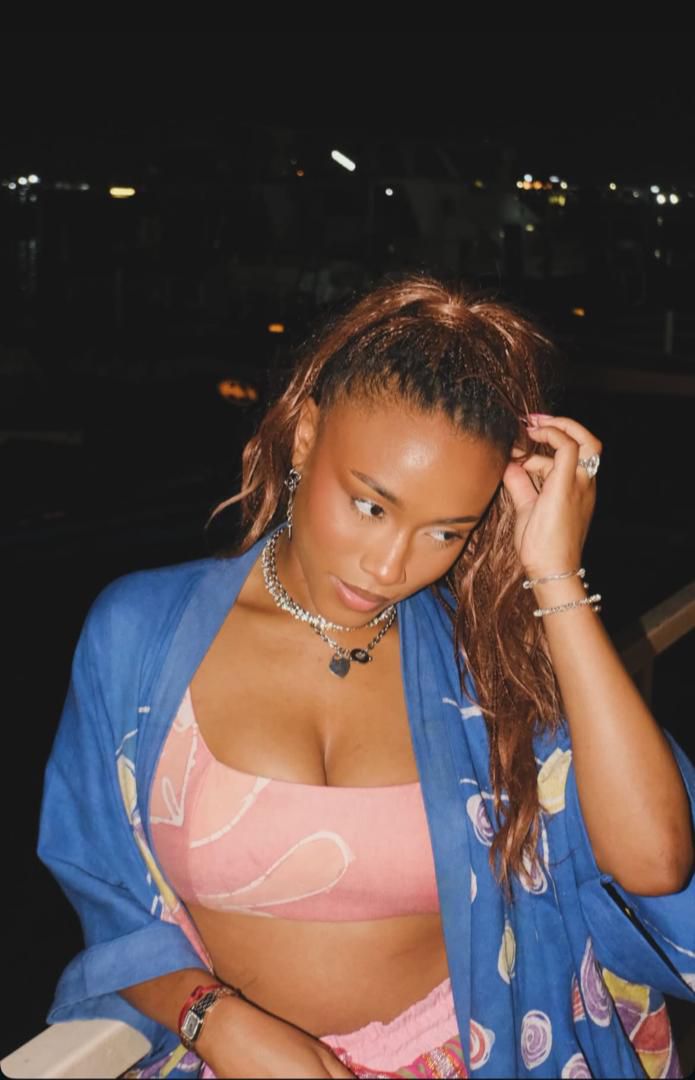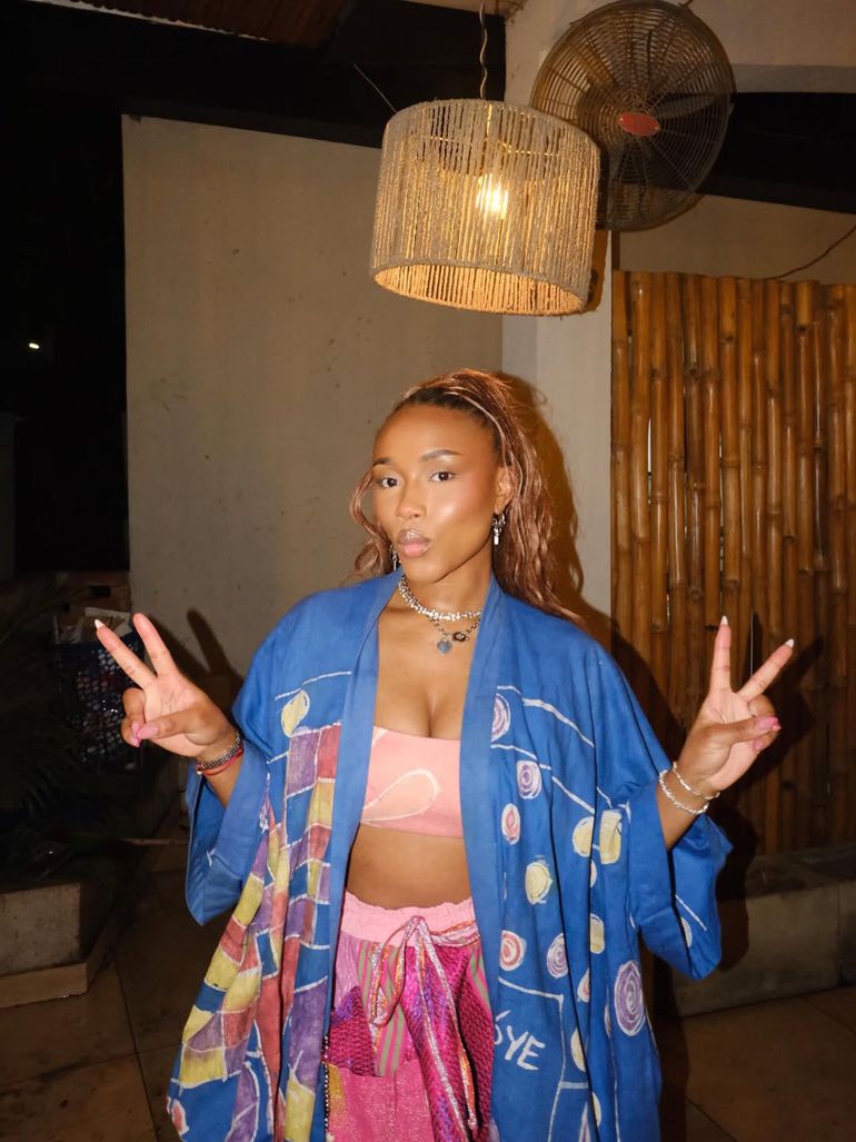 Tolami stepped out in a blush pink co-ord, pairing a bandeau crop top with matching drawstring bottoms and layering the look with a flowing cobalt-blue printed kimono-style cover-up.