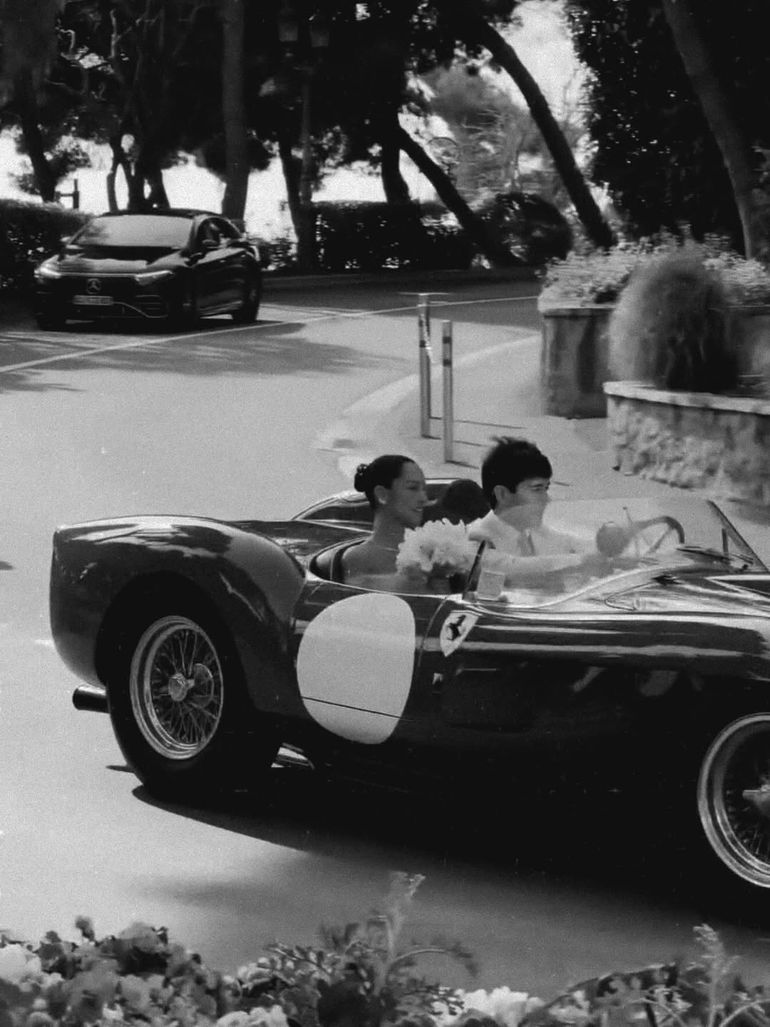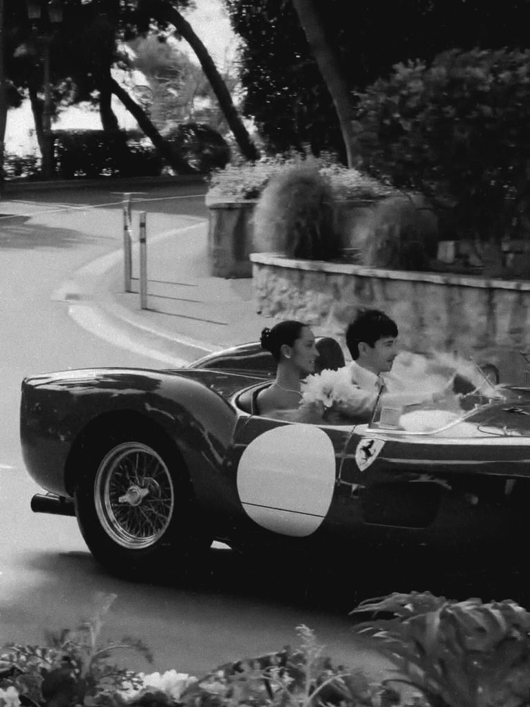 The couple made a grand entrance, or perhaps a victory lap, in one of the world's most iconic automobiles: a 1957 Ferrari 250 Testa Rossa.