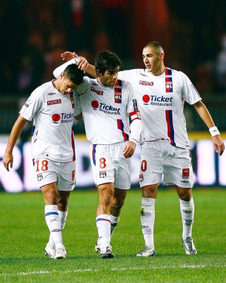 Ben Arfa, Juninho, and Karim Benzema (R) playing for Lyon at their Ligue 1 peak