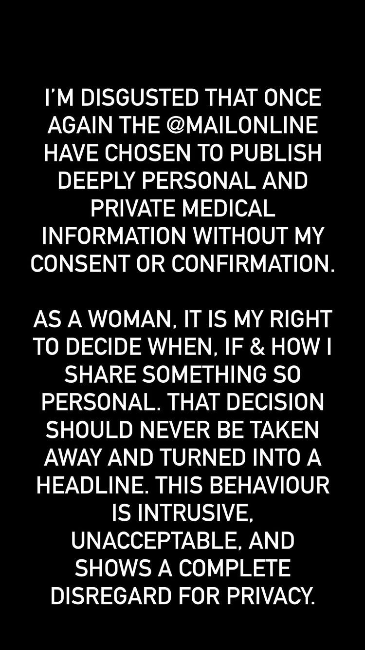 "I'M DISGUSTED THAT ONCE AGAIN THE @MAILONLINE HAVE CHOSEN TO PUBLISH DEEPLY PERSONAL AND PRIVATE MEDICAL INFORMATION WITHOUT MY CONSENT OR CONFIRMATION. AS A WOMAN, IT IS MY RIGHT TO DECIDE WHEN, IF & HOW I SHARE SOMETHING SO PERSONAL. THAT DECISION SHOULD NEVER BE TAKEN AWAY AND TURNED INTO A HEADLINE. THIS BEHAVIOUR IS INTRUSIVE, UNACCEPTABLE, AND SHOWS A COMPLETE DISREGARD FOR PRIVACY."