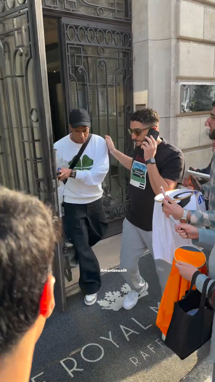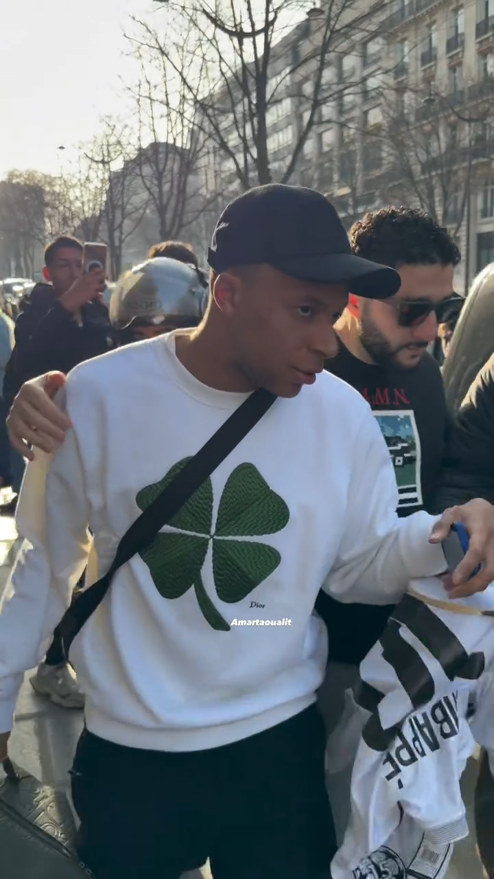 In the video that has amassed over 1.5 million views on X, Mbappé emerges from the hotel's grand entrance dressed casually in a white sweatshirt featuring a prominent green clover logo, black pants, white sneakers, a black cap pulled low, sunglasses, and a black crossbody bag slung over his shoulder.