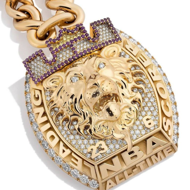The chain is engraved with the title of the NBA's all-time leading scorer. It has the James logo available on his signature shoes as well as other symbolic details of the record.