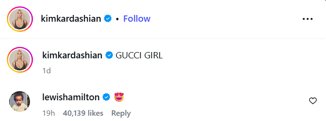 The seven-time F1 world champion left a heart-eye emoji (😍) on Kim K's viral post, publicly declaring his love for her Gucci look.