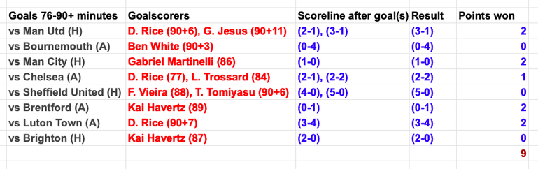 Even though last season’s runners-up have won fewer points with their late goals (9) and have netted 11 times in the concluding minutes of their games, Arteta’s men match Liverpool for matches won by scoring in that period (4).
