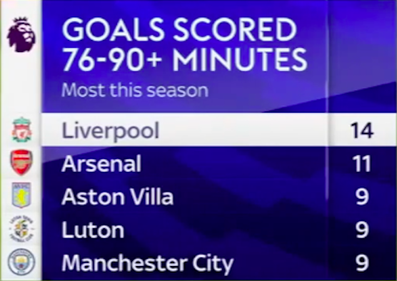 As Liverpool chased a winner against Manchester United on Sunday, Sky Sports revealed an interesting statistic about the Reds in the game’s 78th minute: no Premier League side had found the back of the net more times from the 76th minute onwards.