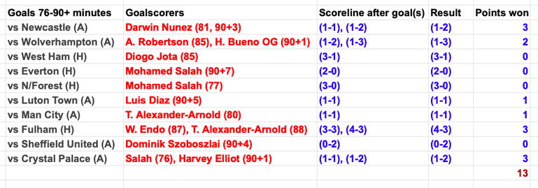 Fourteen of Liverpool's late goals have come in 10 games, and they have claimed 13 points as a consequence. In four matches, goals after minute 75 had no bearing on the eventual result, meaning 60% of the club’s late strikes changed the course of games.