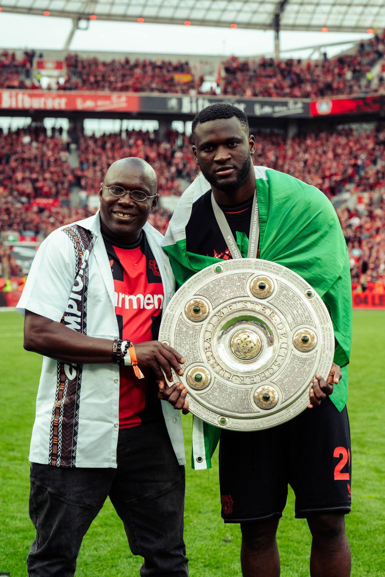 Johnson Blessing at the BayArena with Victor Boniface after Leverkusen win. (Photo Credit: Boniface/X)