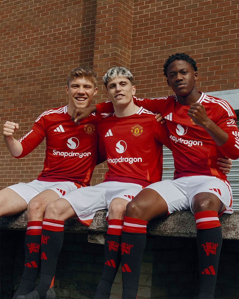The new home jersey was modeled by first team stars Alejandro Garnacho, Kobbie Maino and Rasmus Hojland.
