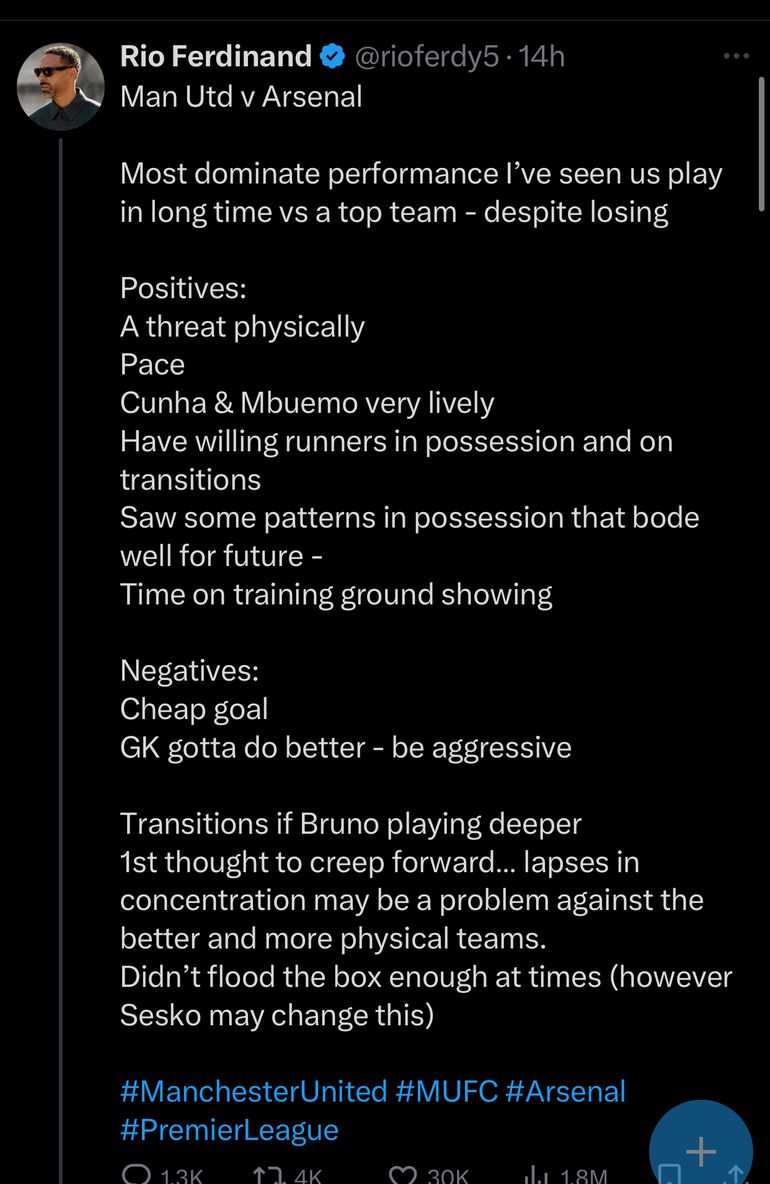 “Most dominant performance I’ve seen us play in a long time vs a top team, despite losing,” Ferdinand wrote.