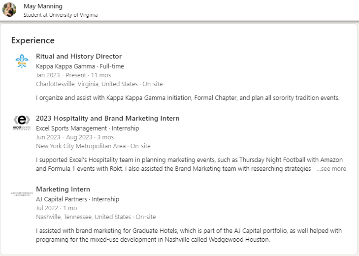 She is currently, per her LinkedIn page, the Ritual and History Director of the Kappa Kappa Gamma sorority at the University of Virginia.