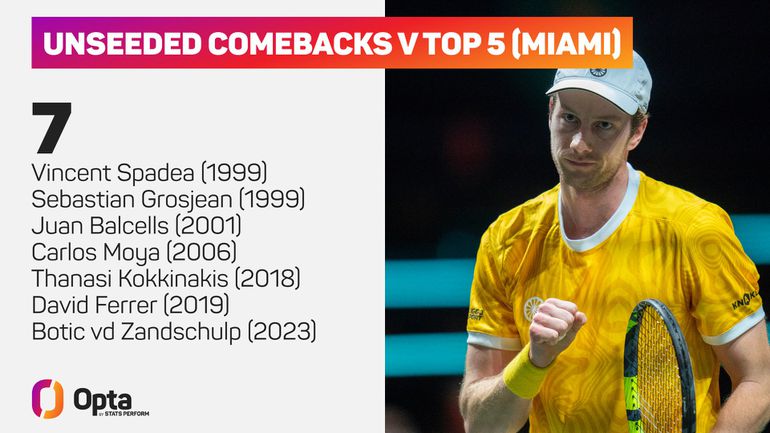 According to Opta Ace, Van de Zandschulp's victory is the seventh unseeded win from a set down against a top-five rank in Miami - since the introduction of the Masters' format in 1990.