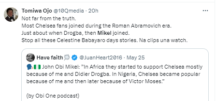 Obi on the podcast said, "In Africa, they started to support Chelsea mostly because of me and Didier Drogba.