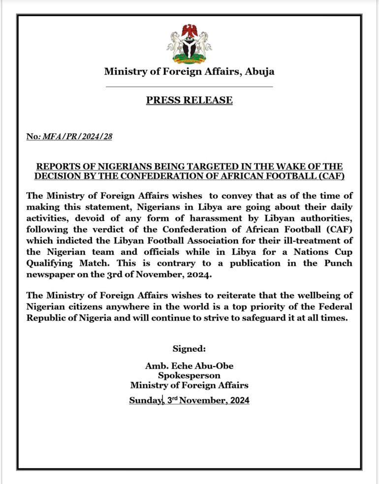 In a statement released on Sunday evening, the Ministry clarified, on X, “As of the time of making this statement, Nigerians in Libya are going about their daily activities, devoid of any form of harassment by Libyan authorities, following the verdict of the Confederation of African Football, which indicted the Libyan Football Association for their ill-treatment of the Nigerian team and officials while in Libya for a Nations Cup qualifying match.”