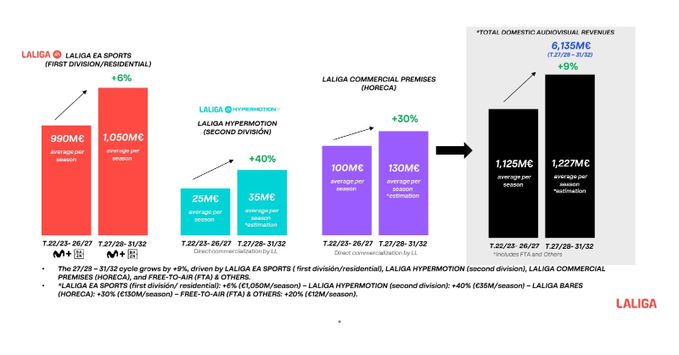 📈 LALIGA will surpass €6.135 billion in domestic audiovisual revenues for the 2027/28–2031/32 cycle, a 9% increase over the previous period.