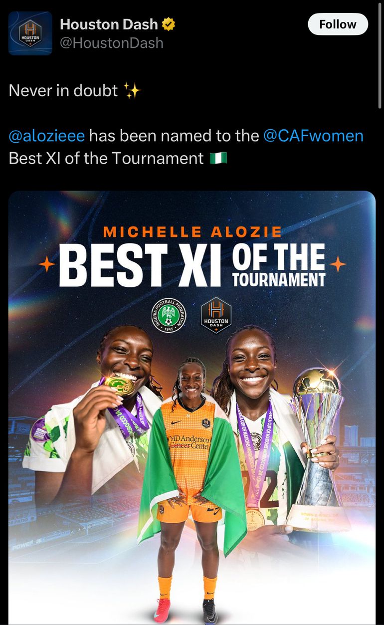 Houston Dash have proudly celebrated their Nigerian star, Michelle Alozie, after she was named in the CAF Women's Best XI of the 2024 Women’s Africa Cup of Nations (WAFCON).