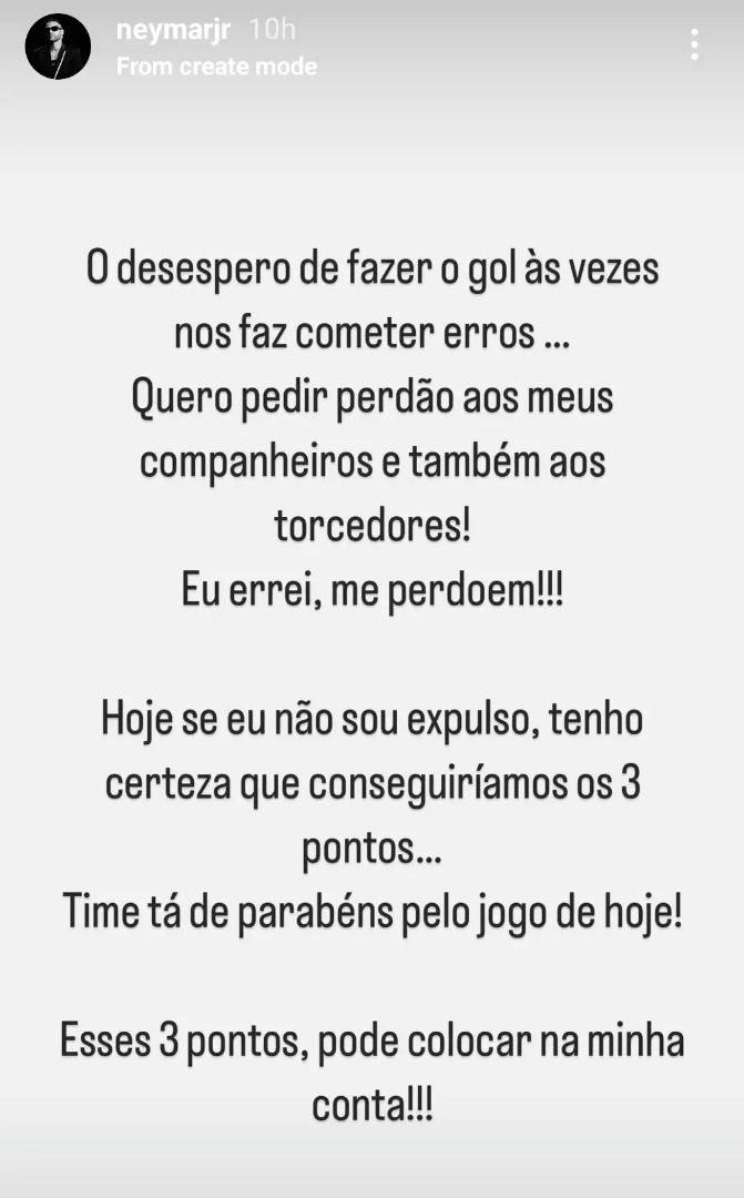 "Desperation to score sometimes leads us to make mistakes," Neymar wrote. "I want to apologise to my teammates and the fans! I made a mistake, forgive me!!!