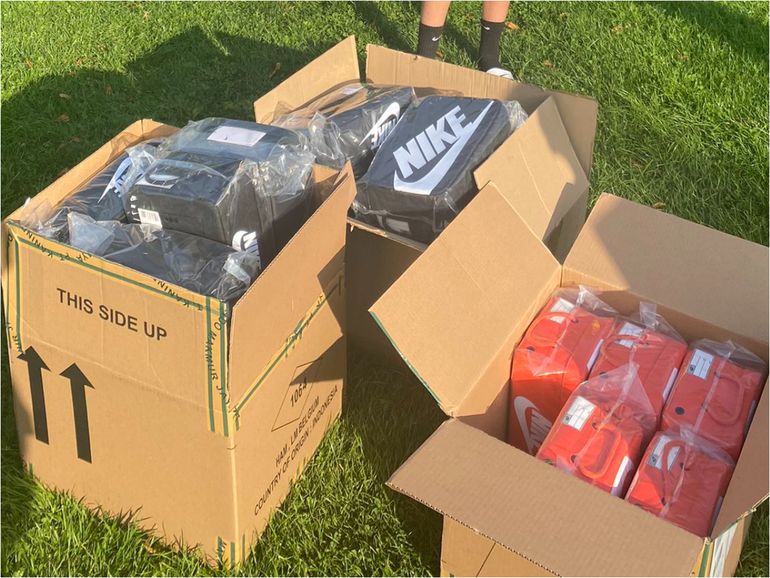 Cartons of Nike boots and balls to be given away by Ashleigh Plumptre. (Photo Credit: Plumtre/X)