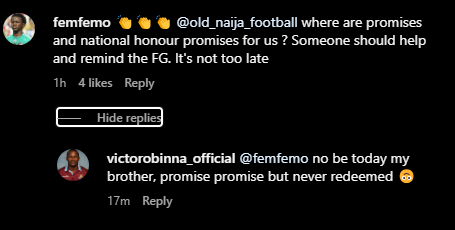 Nsofor, aligning with his teammate's sentiments, lamented the long history of unkept promises with a poignant remark, “No be today my brother, promise promise but never redeemed,” shared via his handle @victorobinna_official.